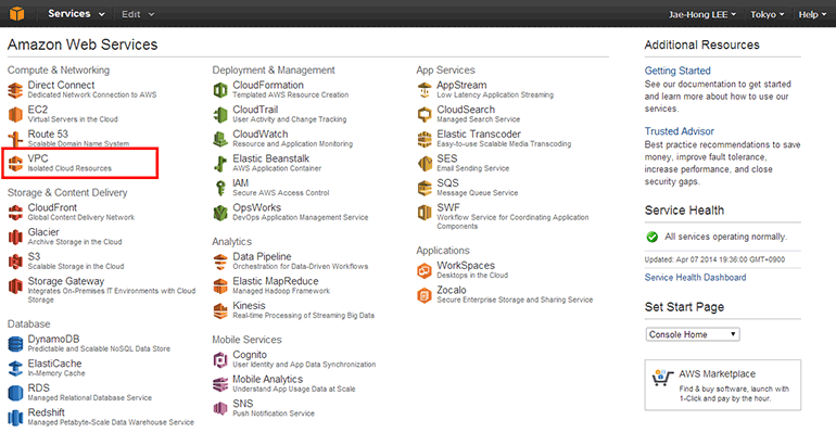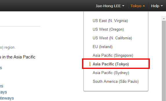 오른쪽 위에서 VPC의 리전을 변경할 수 있습니다. Tokyo 리전을 사용하겠습니다.