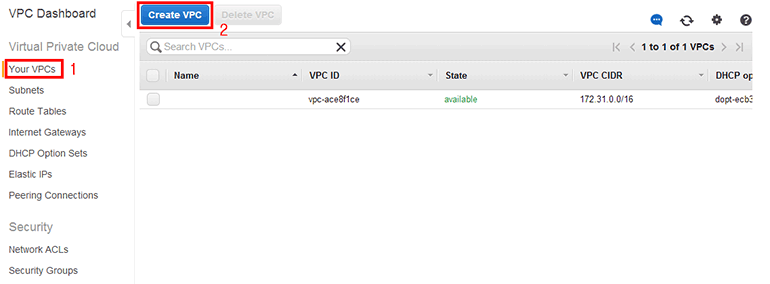 VPC 목록(Virtual Private Cloud → Your VPCs)에서 위쪽 Create VPC 버튼을 클릭합니다.