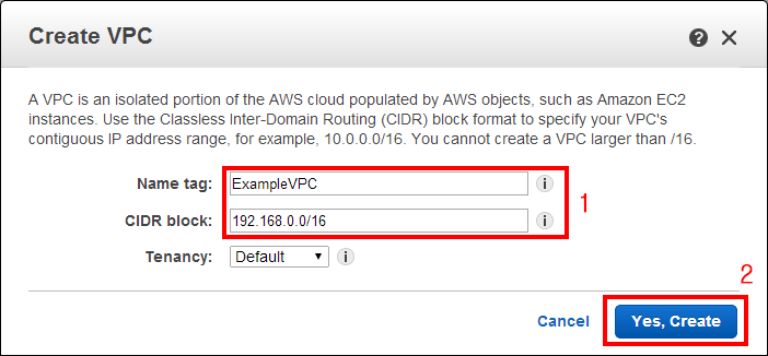 - CIDR block: CIDR 표기법으로 된 IP 대역입니다. 192.168.0.0/16을 입력합니다