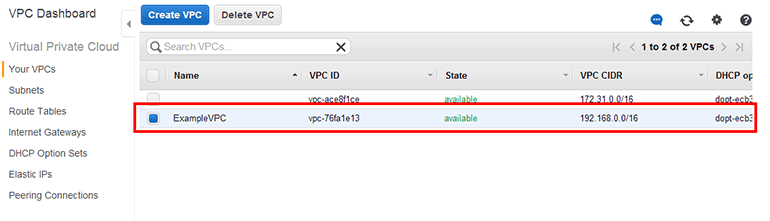 VPC 목록에 VPC(ExampleVPC)가 생성되었습니다.
