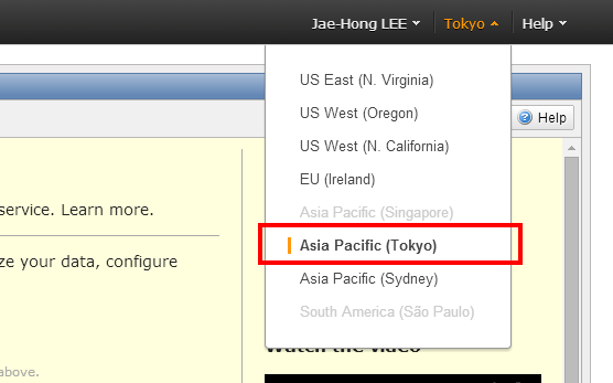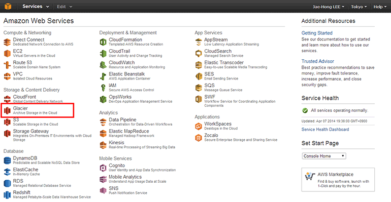 오른쪽 위에서 Glacier의 리전을 변경할 수 있습니다. Tokyo 리전을 사용하겠습니다.