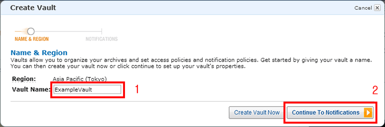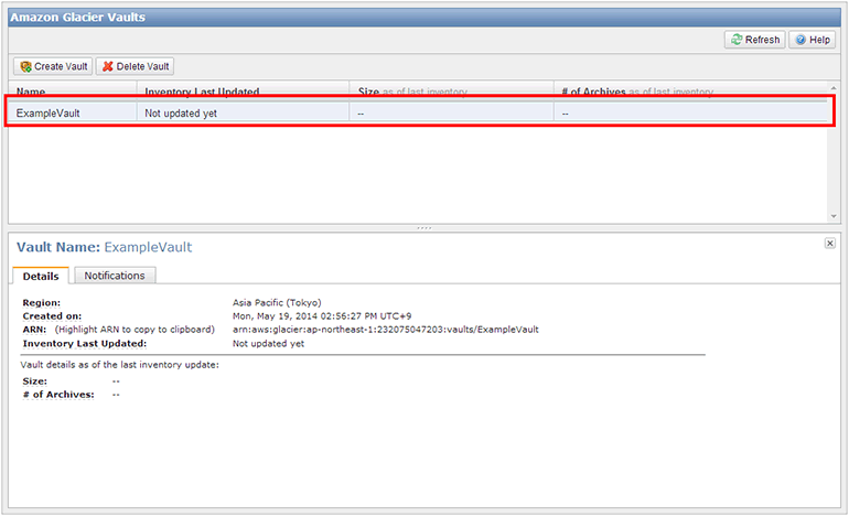Glacier 볼트 목록에 Glacier 볼트(ExampleVault)가 생성되었습니다.