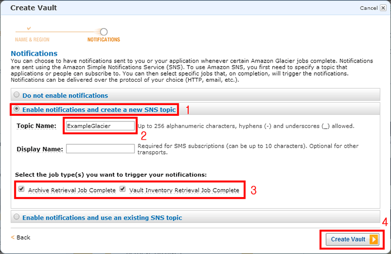 - Vault Inventory Retrieval Job Complete: 볼트 인벤토리 갱신 작업(아카이브 목록을 가져오는 작업)이 완료되었을 때 알림을 보냅니다.