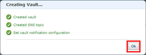 Glacier 볼트 생성이 완료되었다는 알림 창이 표시됩니다. Ok 버튼을 클릭합니다.