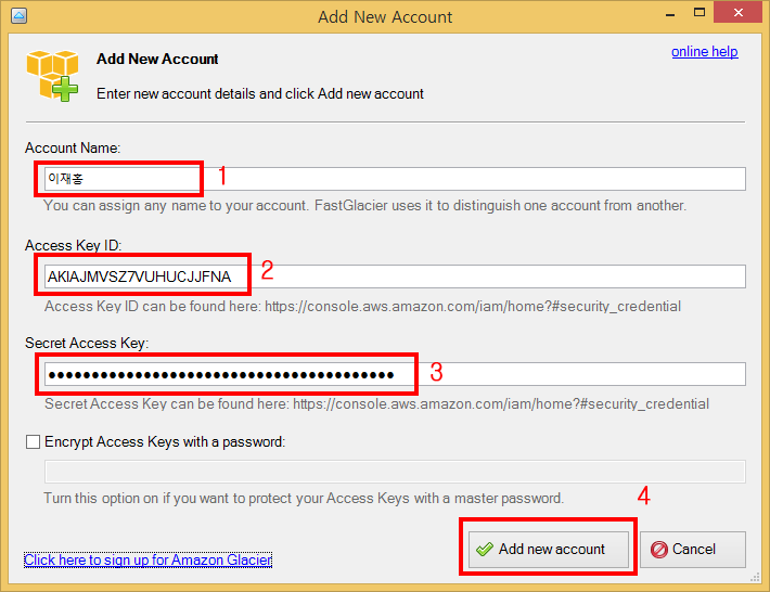 - Account Name: FastGlacier내에서 계정을 구분할 수 있는 이름을 입력합니다.