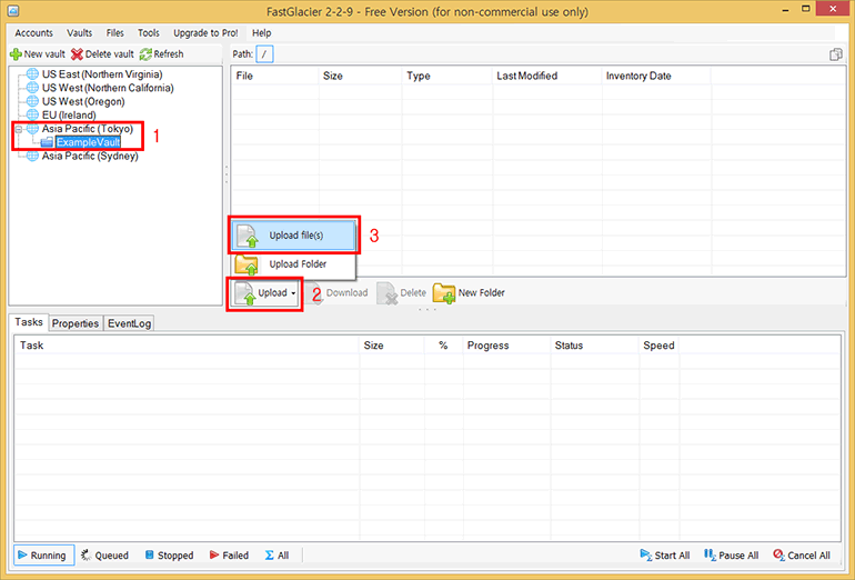 FastGlacier 왼쪽 부분에 리전과 Glacier 볼트의 목록이 표시됩니다. 방금 생성한 Glacier 볼트(Example Vault)를 선택합니다. 그리고 Upload 버튼을 클릭하고, 팝업 메뉴에서 Upload file(s)를 클릭합니다.