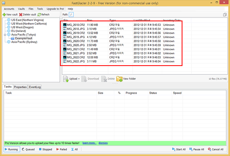 Glacier는 아직 AWS 콘솔에서 파일을 업로드할 수 없습니다. 그래서 무료 Glacier 클라이언트인 FastGlacier를 이용해서 파일을 업로드하고, 반출 요청을 하고, 다운로드해보겠습니다.