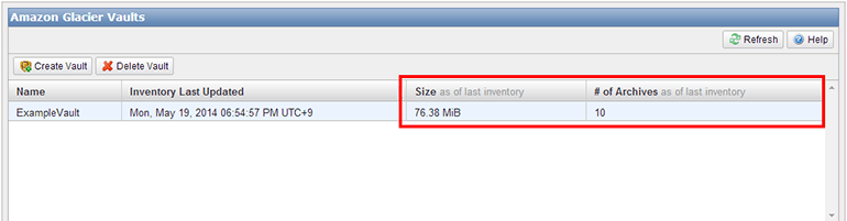 약 하루 정도 지난 뒤 Glacier 볼트 목록을 보면 Glacier 볼트(ExampleVault)의 용량과 아카이브(파일) 개수가 표시됩니다.