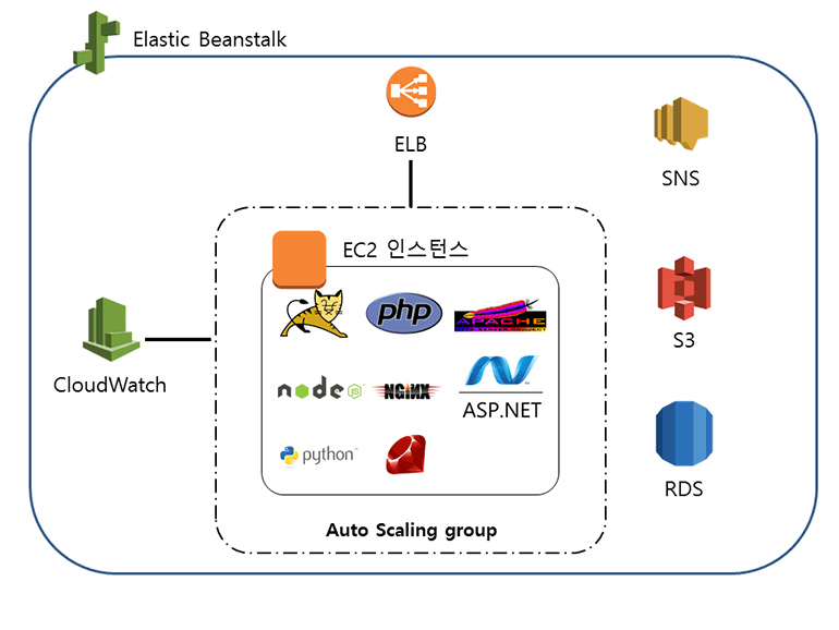 Elastic Beanstalk은 Node.js, PHP, Python, Ruby, Java, .NET 애플리케이션을 실행하고 배포할 수 있는 플랫폼을 제공하는 서비스입니다. Elastic Beanstalk은 실제로 서비스를 제공하는 AWS 리소스가 아니라서 사용 요금이 없습니다.