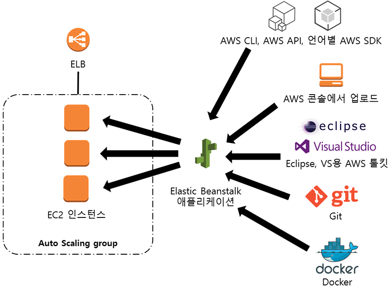 Elastic Beanstalk은 AWS 리소스를 조합하여 완성된 애플리케이션 플랫폼을 제공합니다. 구글 앱엔진, VMware 클라우드 파운드리, Heroku 등과 같은 PaaSPlatform as a Service의 일종입니다. 하지만 기존 PaaS는 플랫폼을 구성하고 있는 서버의 사양과 설정을 직접 제어할 수 없습니다. Elastic Beanstalk은 AWS 리소스를 사용하기 때문에 사용자가 원하는 대로 사양을 정하고 설정을 변경할 수 있는 부분이 큰 장점입니다.