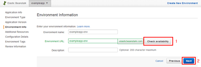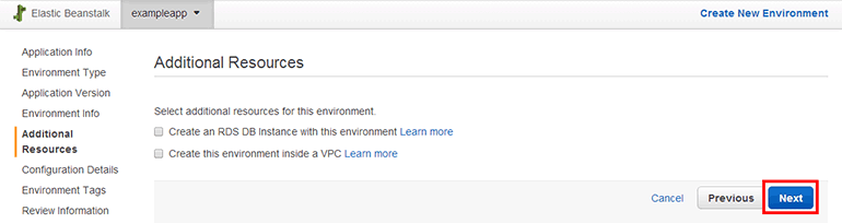 - Create an RDS DB Instance with this environment: RDS DB 인스턴스를 생성하는 옵션입니다. 이번에는 DB 인스턴스를 생성하지 않을 것이므로 기본값 그대로 체크하지 않습니다.