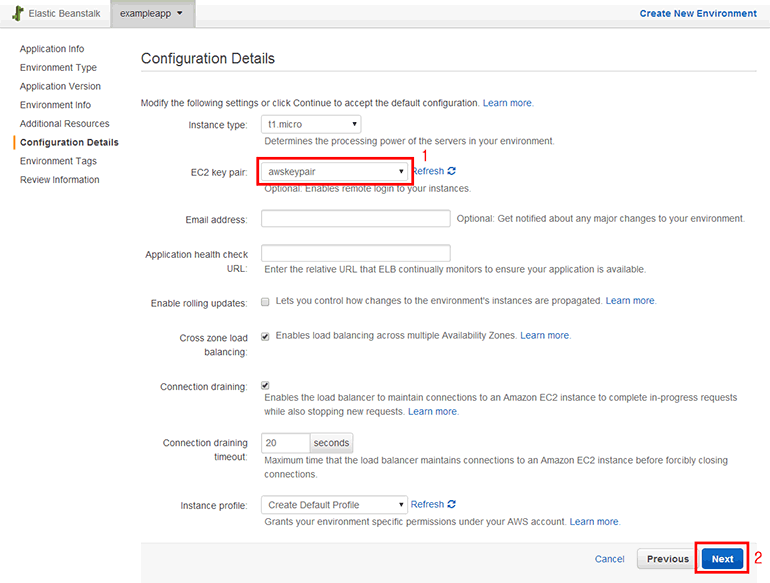 http://docs.aws.amazon.com/elasticbeanstalk/latest/dg/using-features.rollingupdates.html - Cross zone load balancing: 여러 가용 영역에 EC2 인스턴스를 생성하여 로드 밸런싱을 하는 옵션입니다. 기본값 그대로 사용합니다.
