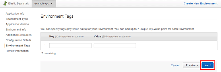 Elastic Beanstalk의 환경에 태그를 설정합니다. 7개까지 생성할 수 있습니다. Next 버튼을 클릭합니다.