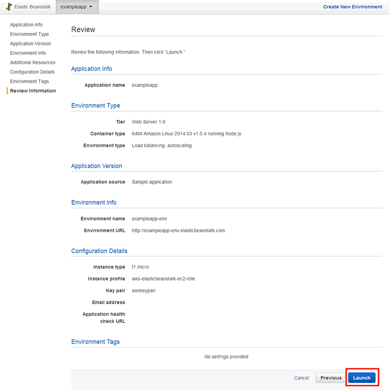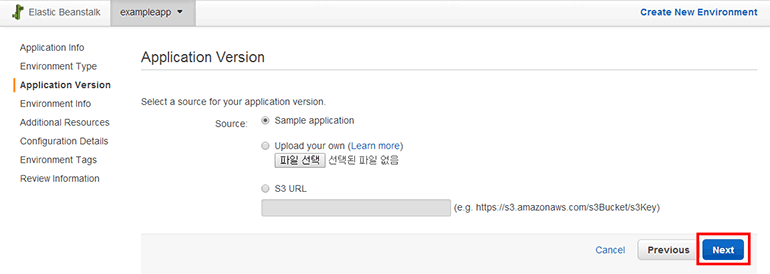 - Launch a new environment running this application: 애플리케이션이 실행될 환경을 생성하는 옵션입니다. 애플리케이션은 환경이 없으면 실행할 수 없으니, 나중에라도 생성해야 합니다. 이미 생성된 환경을 사용할 수도 있습니다.