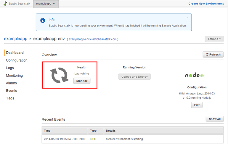 Elastic Beanstalk에 사용자가 애플리케이션을 업로드하는 공간을 애플리케이션Application이라고 하고, 애플리케이션을 실행하는 플랫폼을 환경Environment이라고 합니다. Node.js 애플리케이션과 환경을 생성하고, 간단한 문자열을 출력해보겠습니다.