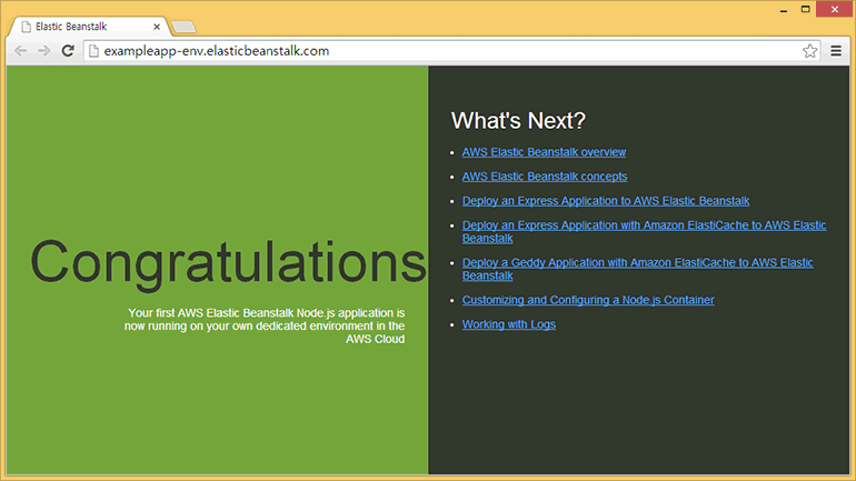 웹 브라우저에서 Elastic Beanstalk URL에 접속하면 예제 애플리케이션의 내용이 표시됩니다.