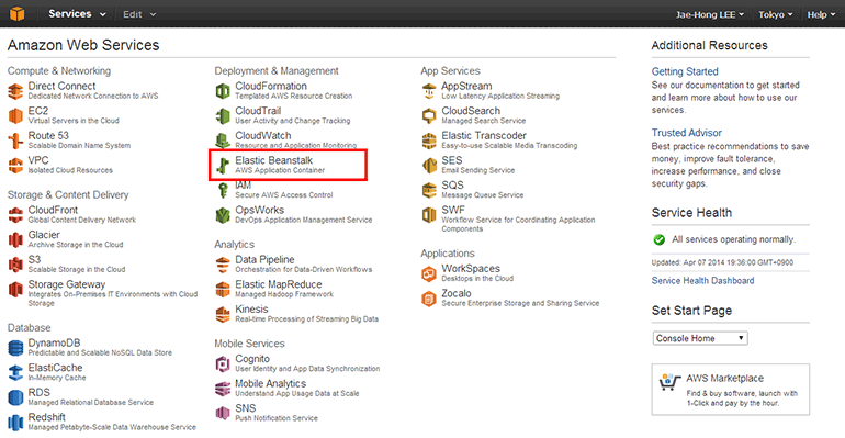 AWS 콘솔로 접속한 뒤 메인 화면에서 Deployment & Management의 Elastic Beanstalk을 클릭합니다.