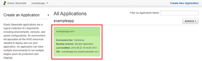 app.js 파일과 package.json 파일을 zip으로 압축합니다. 저는 exampleapp.zip으로 압축했습니다. Elastic Beanstalk 메인 페이지에 애플리케이션과 환경 목록이 표시됩니다. 방금 생성한 Elastic Beanstalk 환경(exampleapp-env)을 클릭합니다.