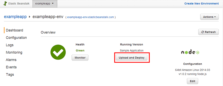 Elastic Beanstalk 환경 페이지에서 Upload and Deploy 버튼을 클릭합니다.