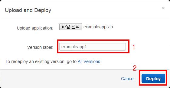 파일을 열면 Version label에 파일명이 그대로 입력됩니다. 애플리케이션을 업로드할 때마다 Version label이 달라져야 합니다. 여기서는 exampleapp1을 입력합니다(다음 번에는 exampleapp2 exampleapp3 등으로 입력합니다). 설정이 완료되었으면 Deploy 버튼을 클릭합니다.