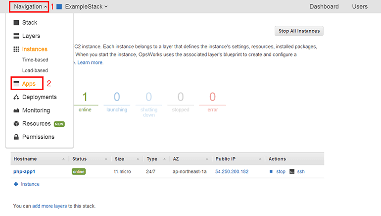 OpsWorks 인스턴스 목록에서 위쪽 Navigation을 클릭하면 팝업 메뉴가 나옵니다. Apps를 클릭합니다.