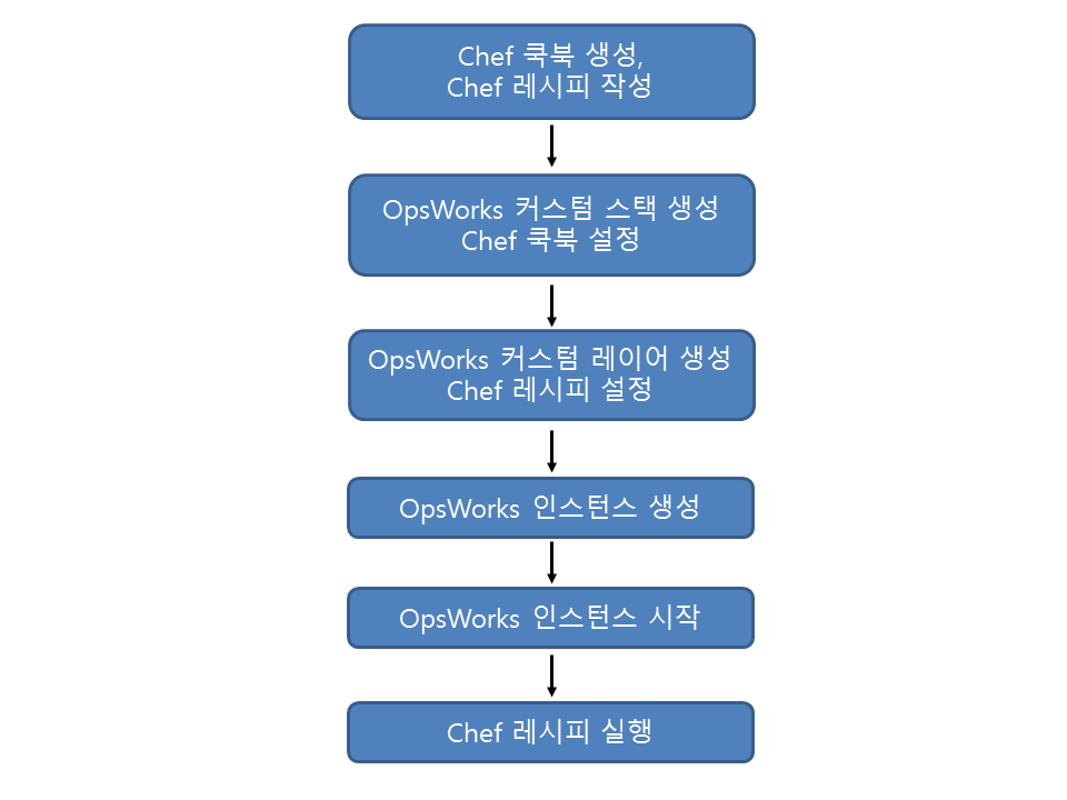 OpsWorks에서 제공하는 Chef 레시피가 아닌 인터넷에 공개된 Chef 레시피를 사용해보겠습니다. OpsWorks에서 커스텀 Chef 레시피를 사용할 때 작업 흐름은 다음과 같습니다.