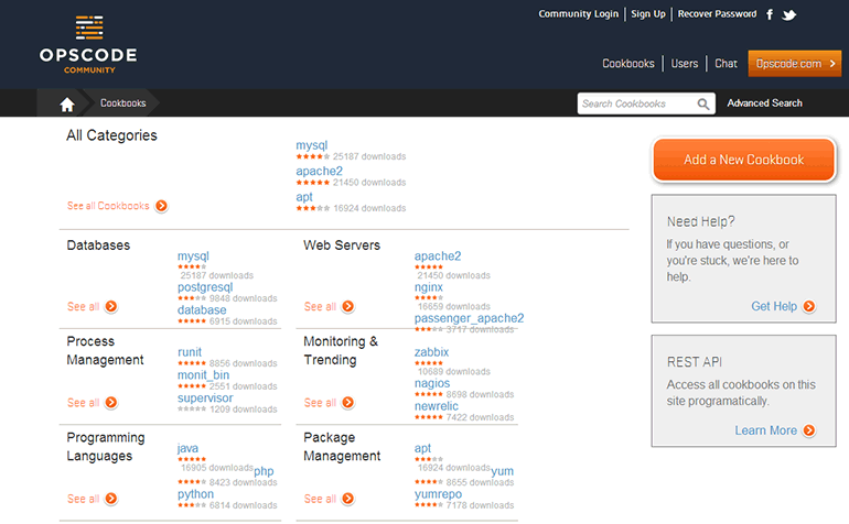 Chef 웹사이트는 전 세계 많은 사람이 개발한 Chef 쿡북을 제공합니다. 여기에는 왠만한 소프트웨어 쿡북은 다 있습니다. http://community.opscode.com/cookbooks