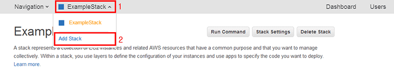 OpsWorks 스택 페이지에서 위쪽 스택 이름을 클릭하면 팝업 메뉴가 나옵니다. Add Stack을 클릭합니다.
