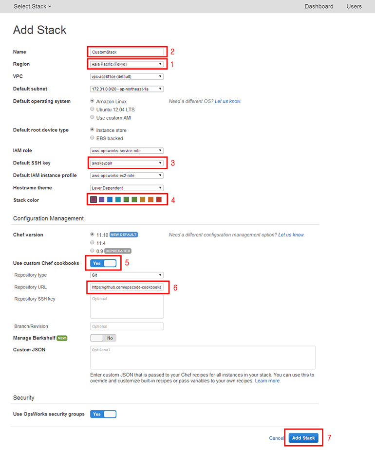 - Use custom Chef cookbooks: OpsWorks에서 제공하는 Chef 쿡북 이외에 인터넷에 공개된 Chef 쿡북이나 사용자가 작성한 Chef 쿡북을 사용하는 옵션입니다. Yes를 선택합니다.