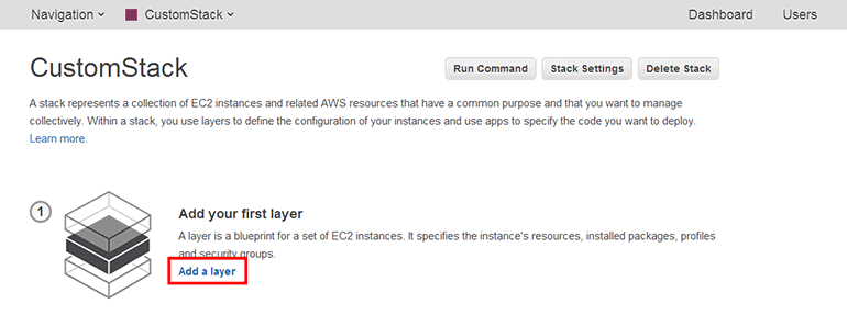 OpsWorks 커스텀 스택이 생성되었습니다. Add a layer를 클릭합니다.