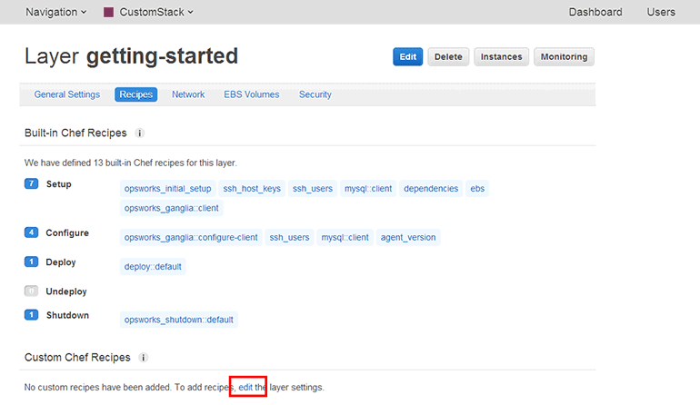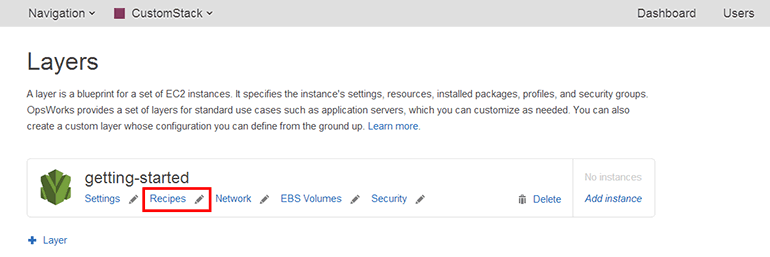 OpsWorks 커스텀 레이어가 생성되었습니다. getting-started 레이어의 Recipes를 클릭합니다.
