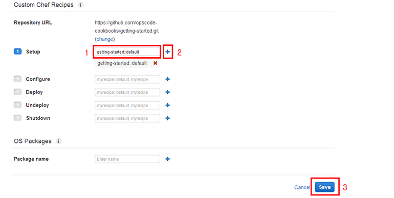 - Repository URL: Chef 쿡북 저장소 URL입니다. https://github.com/opscode-cookbooks/getting-started.git를 입력합니다.