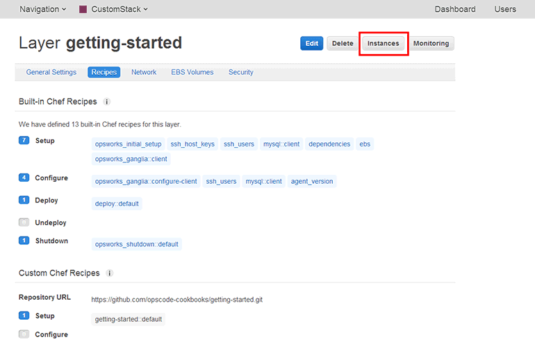 커스텀 Chef 레시피 설정이 저장되었습니다. 위쪽 Instances 버튼을 클릭합니다.