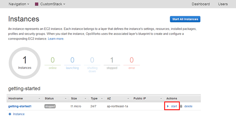 OpsWorks 인스턴스가 생성되었습니다. 아직은 정지 상태이므로 start를 클릭합니다.