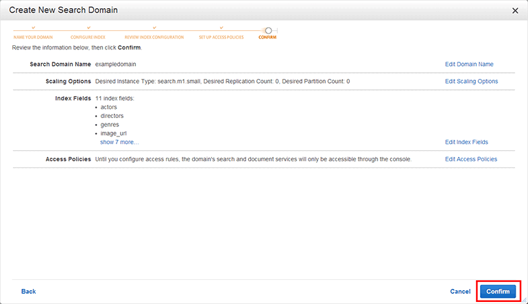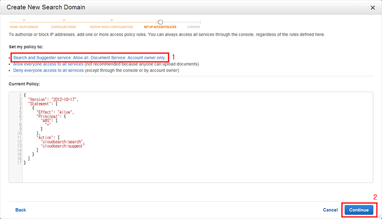 - Search and Suggester service: Allow all, Document Service: Account owner only: 검색은 모두 허용하고, CloudSearch를 생성한 AWS 계정만 데이터를 업로드 할 수 있습니다.