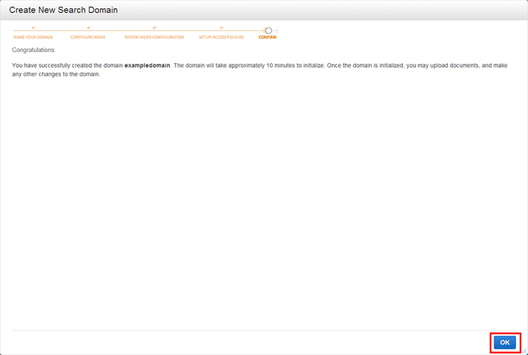 CloudSearch 검색 도메인 생성이 시작되었습니다. OK 버튼을 클릭합니다.
