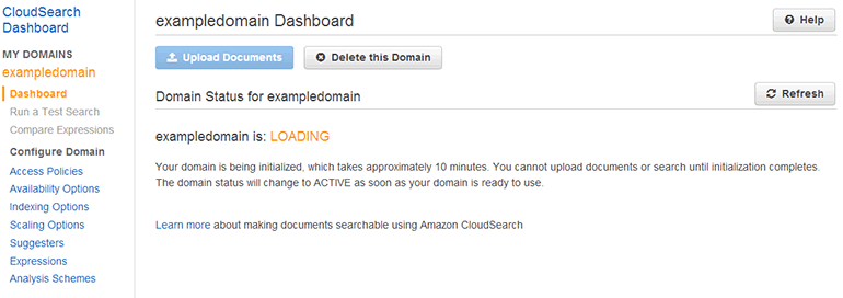 CloudSearch 검색 도메인 목록에 검색 도메인(exampledomain)이 생성되었습니다. 완전히 생성되기까지 약 10분정도 소요됩니다.