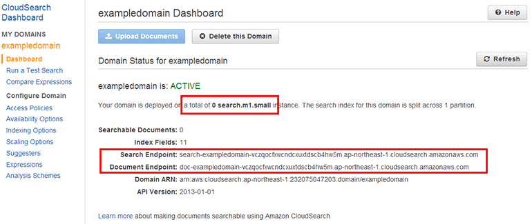 CloudSearch 검색 도메인 생성이 완료되었습니다. 검색 도메인(exampledoamin)의 세부 내용에 검색 엔드포인트 주소, 문서 엔드포인트 주소가 표시됩니다. 엔드포인트 주소에 HTTP 메서드를 이용하여 데이터를 올리거나 검색 요청을 할 수 있습니다.