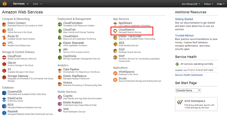 AWS 콘솔로 접속한 뒤 메인 화면에서 App Services의 CloudSearch를 클릭합니다.