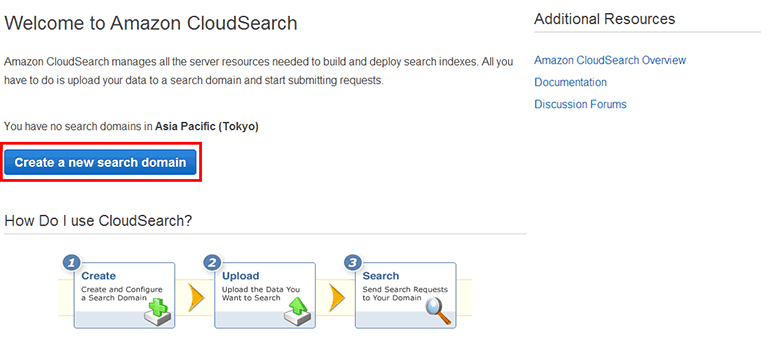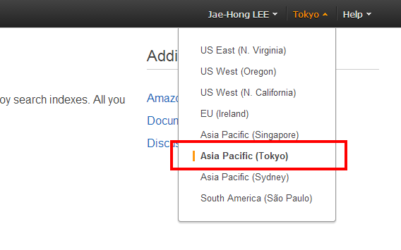 오른쪽 위에서 CloudSearch의 리전을 변경할 수 있습니다. Tokyo 리전을 사용하겠습니다.
