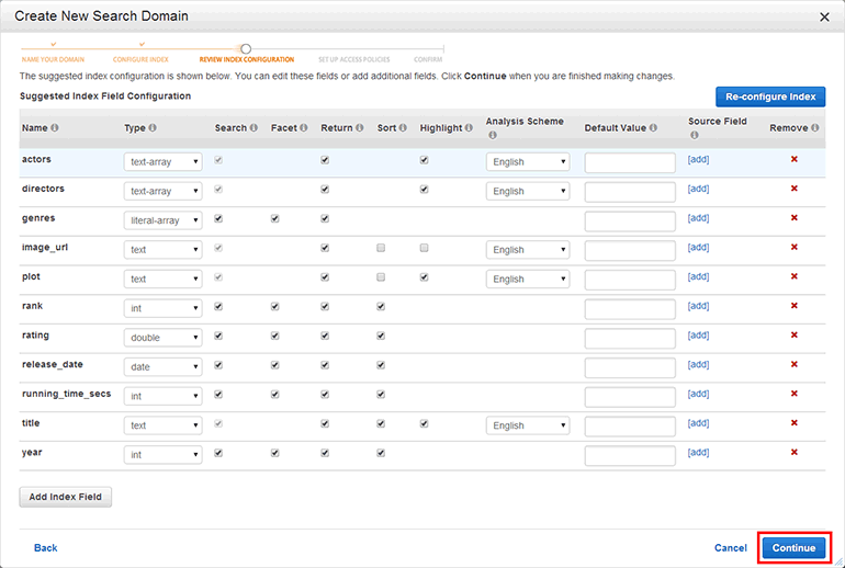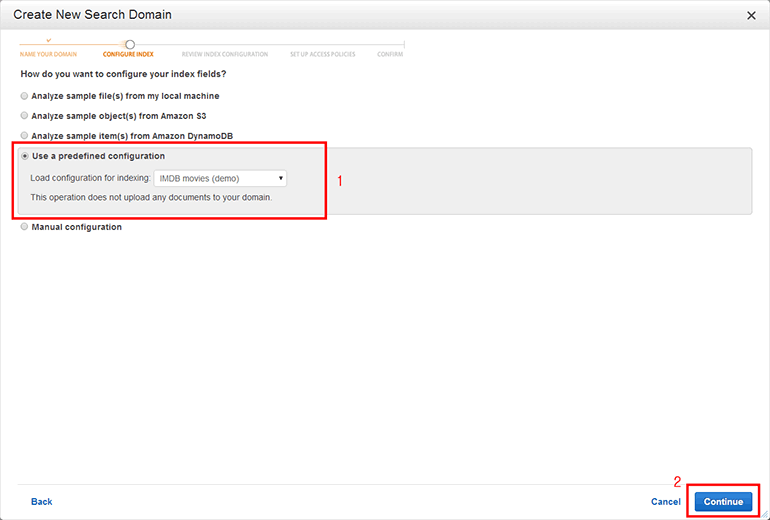 CloudSearch 검색 도메인의 인덱스를 정의합니다. 여기서 선택한 데이터를 분석하여 인덱스를 정의하게 됩니다. Use a predefined configuration을 선택한 뒤 기본값 그대로 IMDB movies(demo)를 선택합니다.