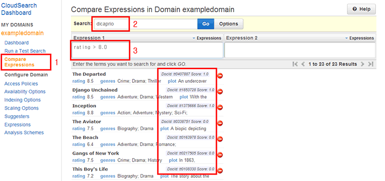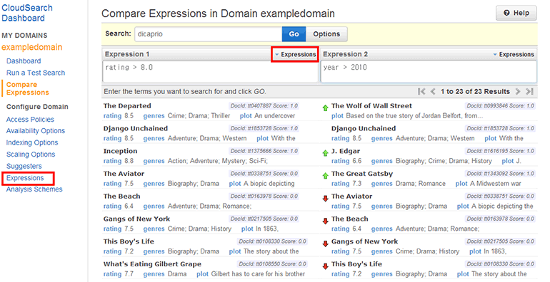 검색 도메인(exampledomain)에서 왼쪽 Compare Expressions를 클릭합니다. Search 부분에 dicaprio를 입력하고 Expression 1 부분에 rating > 8.0을 입력합니다. 잠시 기다리면 결과가 출력됩니다.