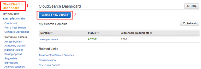 이 데이터를 기반으로 검색 도메인을 생성하겠습니다. CloudSearch Dashboard를 클릭한 뒤 Create a New Domain 버튼을 클릭합니다.