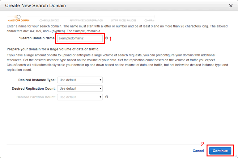 • Desired Replication Count: 검색 도메인의 복제 개수입니다. 데이터 저장 용량과는 상관 없고, 검색 트래픽이 많을 때 설정합니다. 5개까지 설정할 수 있습니다. 기본값 그대로 사용합니다.