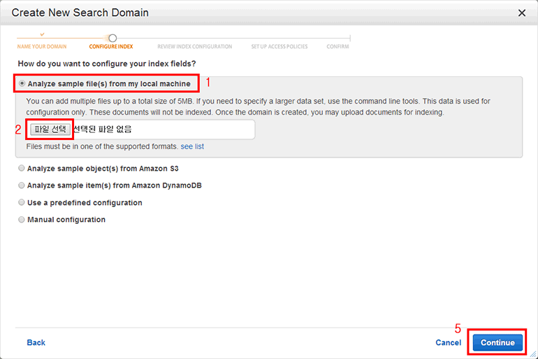 CloudSearch 검색 도메인의 인덱스를 정의합니다. 방금 작성한 data.json을 이용하겠습니다. Analyze sample file(s) from my local machine을 선택하고 파일 선택 버튼을 클릭합니다(그림 25-30).