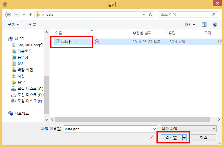 파일 열기 창에서 방금 작성했던 data.json 파일을 선택하고 열기 버튼을 클릭합니다.