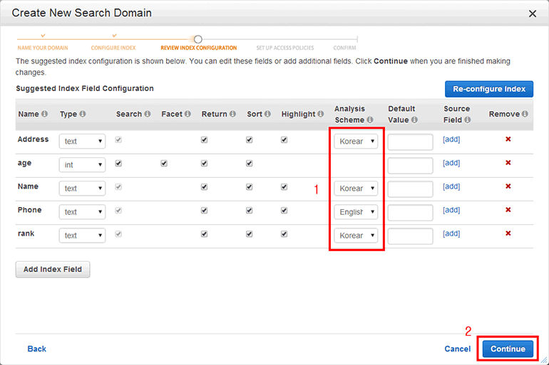 data.json을 분석하여 인덱스가 생성되었습니다. Analysis Scheme에서 Address, Name, rank를 Korean으로 설정합니다. Phone과 같이 숫자로만 된 필드는 Korean으로 설정하지 않아도 상관없습니다. 설정이 완료되었으면 Continue 버튼을 클릭합니다.
