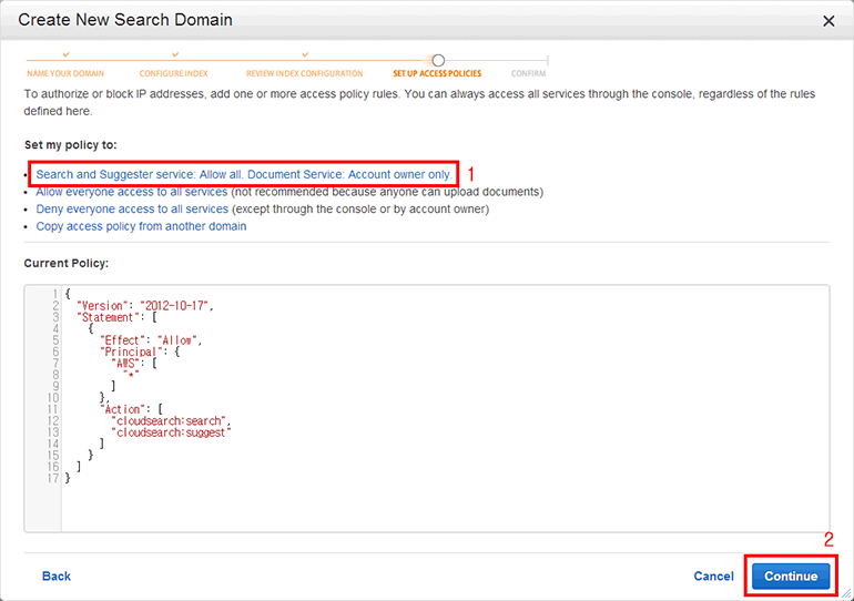 • Search and Suggester service: Allow all, Document Service: Account owner only: 검색은 모두 허용하고, CloudSearch를 생성한 AWS 계정만 데이터를 업로드 할 수 있습니다.