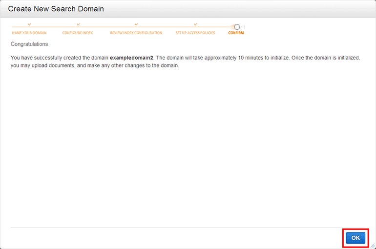 CloudSearch 검색 도메인 생성이 시작되었습니다. OK 버튼을 클릭합니다.