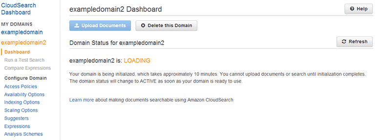 CloudSearch 검색 도메인 목록에 방금 생성한 검색 도메인(exampledomain2)이 추가되었습니다. 완전히 생성되기까지 약 10분정도 소요됩니다.